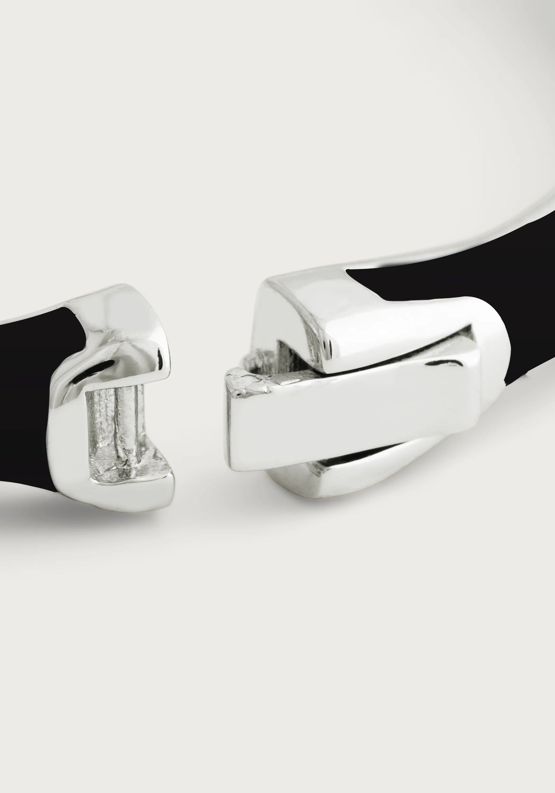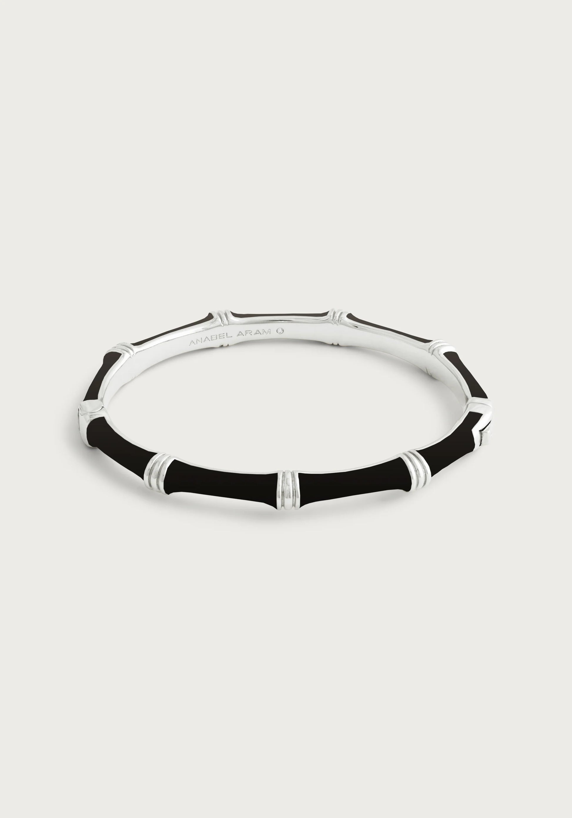 Elevate your everyday looks with the radiant allure of this bamboo hinged bangle, now in 4 new beautiful hand painted enamel colors. Crafted from striking sterling silver dipped brass, the bangle is sculpted to perfection, adorned with sparkling crystals that catch the light with every movement. Its secure hidden clasp, reminiscent of the finest jewelry craftsmanship, ensures both elegance and ease of wear, making it a refined accessory for any occasion. In the realm of accessories, this bamboo hinged bangle stands out as an exceptional piece of artistry. The intricacy of the sculpted design and the shimmering crystals culminate in a perfect union of glamour and versatility. The hidden clasp adds an element of mystery and refinement, making this bangle a stunning addition to your collection. Whether paired with casual or formal attire, it promises to be the perfect touch of sophistication, adding a radiant sparkle to your daily ensembles.