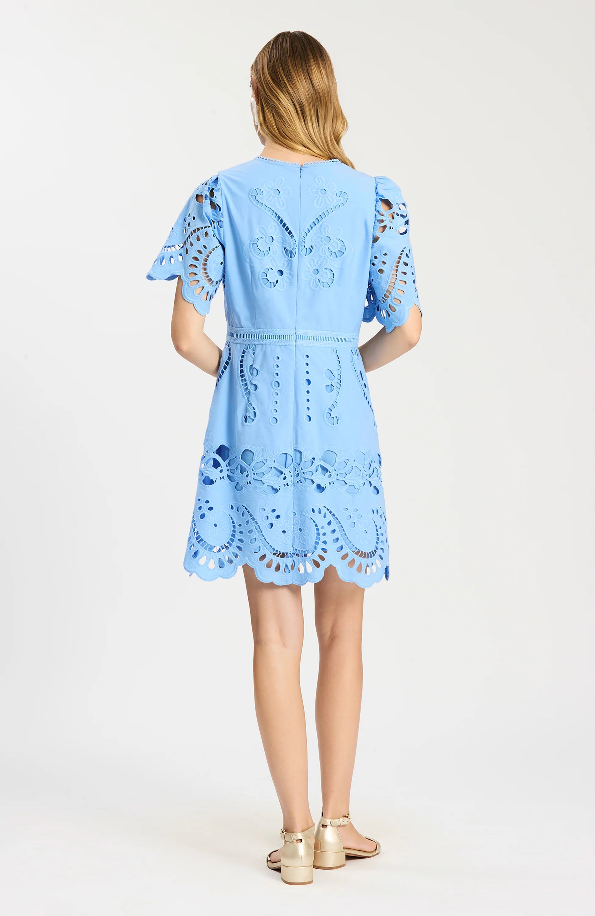 A beautifully detailed warm-weather dress designed to make an effortless statement. Crafted in beautifully detailed eyelet with intricate embroidery and scalloped edges, this feminine silhouette feels both polished and breezy. Softly structured sleeves and a defined waist create a flattering shape that moves seamlessly from daytime celebrations to summer evenings. Perfect for weddings, vacations, and seasonal events, it pairs beautifully with sandals or wedges for an elevated warm-weather look.