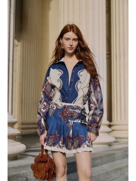 The Sand Arabesque Scarf Collared Organic Cotton Shirt from FARM Rio enchants with its bold arabesque print in deep blues, warm sand, and intricate rust accents. Crafted from 100% certified organic cotton, its relaxed silhouette and structured collar embrace a harmonious blend of comfort and elegance. This playful yet sophisticated top invites you to express your spirit with a touch of timeless artistry and conscious luxury.