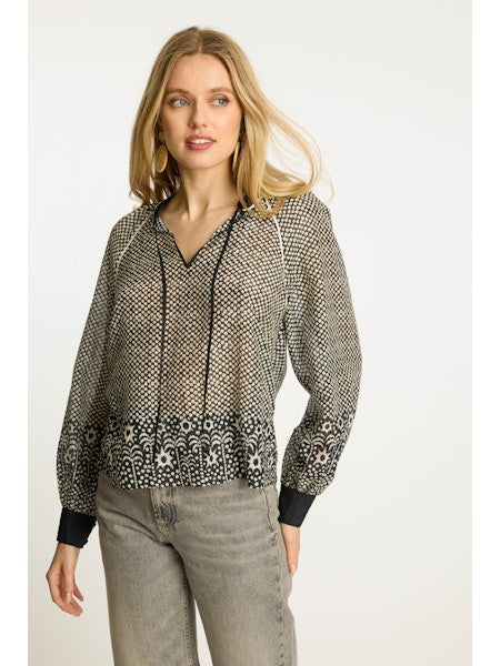 Featuring a subtle V-neckline with tie detailing and lightly gathered long sleeves, this top is elevated by the Indigo Dot print, a textured pattern of organic dots and palm-inspired motifs in classic navy and cream.